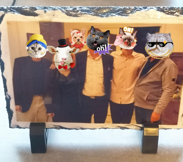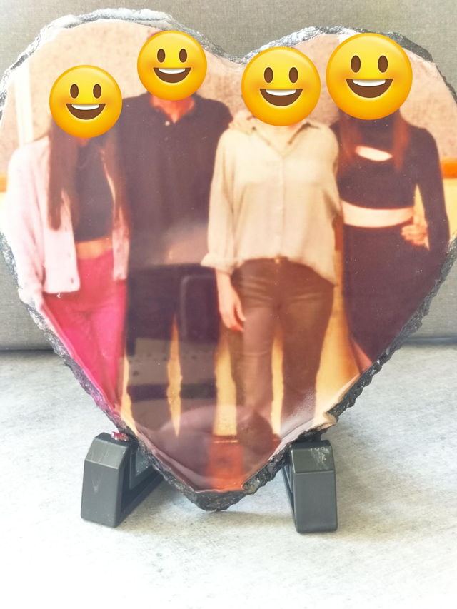 Je transfère vos photos sur ardoise grâce à une technique de presse par chaleur.